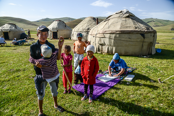 | junge Damen dabei haben, die sich mit den einheimischen verständigen können. Wir sind herzlich willkommen und werden in verschiedene Jurten aufgeteilt - Schluss mit Einzelzimmer - wir haben eine |