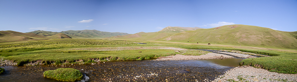 | Nach den Reiterspielen haben wir den Rest des Tages zur Freien - Verfügung - Ich gehe an den nahe ge-legenen Fluss - genieße die Stille, die Pferde und das Plätschern des Wassers. In der Ferne eine riesige |