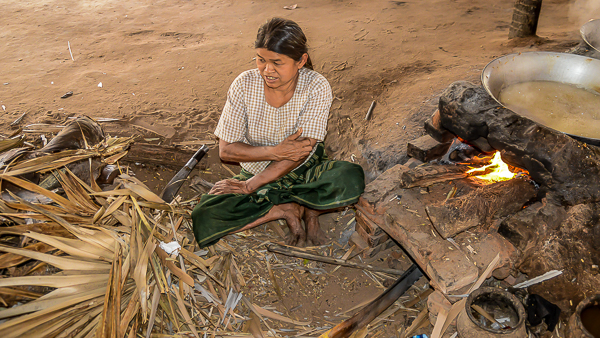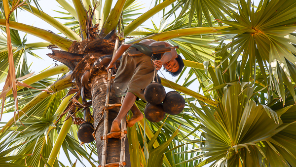 Wir sind unterwegs zu unserer letzten Station im Raum Bagan, wir schauen uns noch auf einer Palmen-plantage um und werden uns die Verarbeitung des Palmsaftes ansehen. Hoch aus der Spitze, Barfuss allerdings mit einer Leiter klettert dieser junge Mann hoch in die Palme und bringt den frisch gezapften