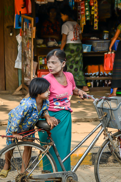 Es ist ein geschäftiges Treiben auf der Insel zu finden. Überall in den offenen Häusern wird gearbeitet. Hier wird Bambus behauen und die brauchbaren Teile geerntet. Mutter bringt die Tochter zwar nicht in den Kindergarten, aber sie muss auf jeden Fall nicht zu Fuß laufen, sie haben ein Rad und das ist schon viel.