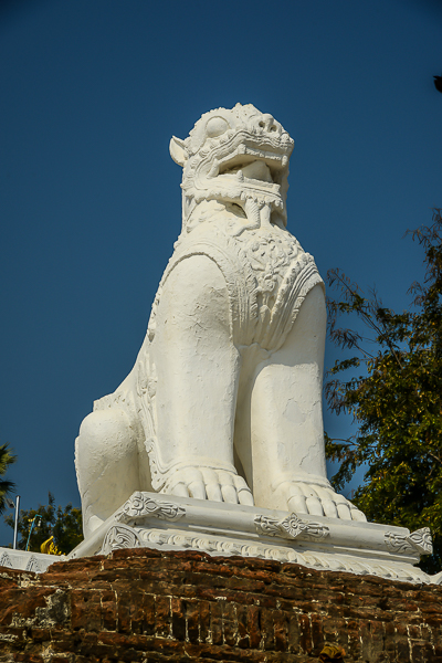 Schnee weiß strahlt sie in der Sonne - Vorn zwei Chinthei- riesig und imposant. Wir haben die 1881 errichtete Set - taw - ya Pagode erreicht. In deren Inneren soll ein Fußabdruck des Buddha in Marmor ausgestellt sein. Viele Wächterfiguren flankieren den Aufgang. Wir klettern natürlich hoch über sieben mit
