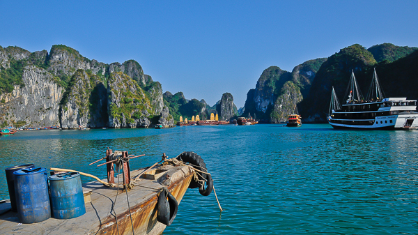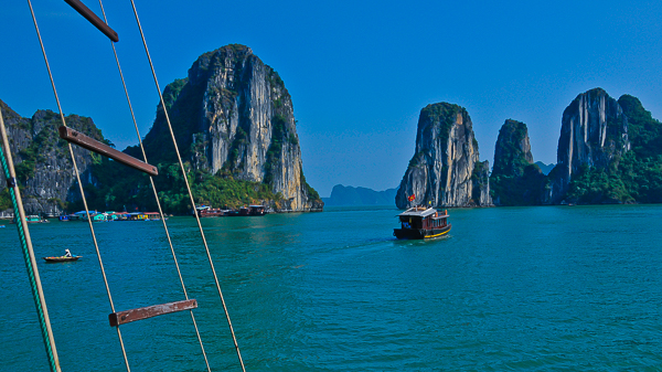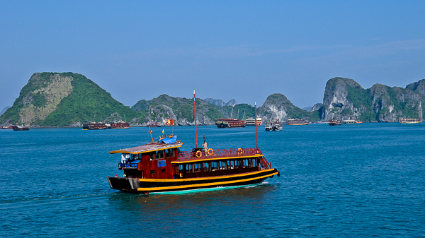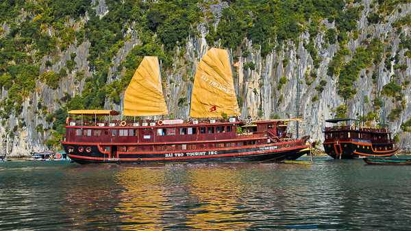sehr schöne hölzerne Dschunke für eine Bootsfahrt in der Bucht. Gleichzeitig wird diese Dschunke auch unser Domizil für die Nacht sein, denn wir werden heute auf dem Schiff übernachten - Sicherlich ein besonderes Erlebnis. Die Ha-Long-Bucht hat nahezu 2000 Inseln, die in einem 1553 qkm großen Gebiet |