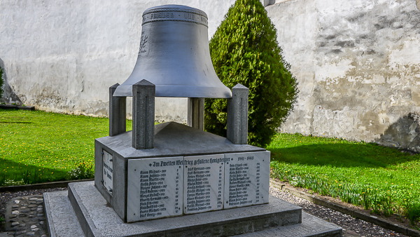der Traufe an das Mittelschiff schmiegen. Der Glockenturm mit seinen acht Geschossen befindet sich im Westteil des Mittelschiffes und wird von den beiden Seitenschiffen flankiert. Die Kirchenburg ist riesig.