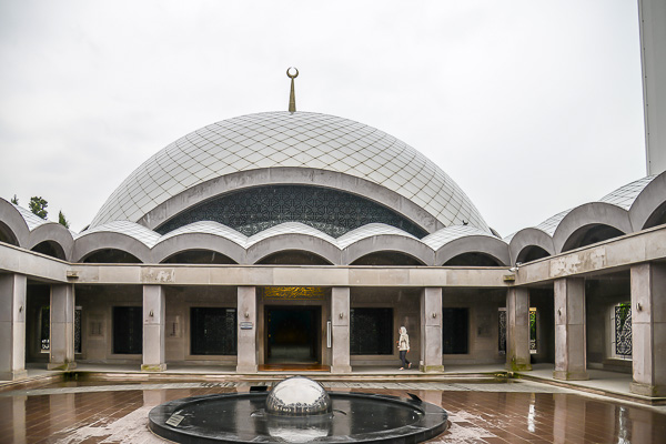am 8.5.2009 eröffnet wurde und etwa 500 Gläubigen Platz zum Beten bietet. Wir sind sehr beeindruckt von diesem Bauwerk. Leider regnet es in Bindfäden, so haben wir kaum eine Möglichkeit, die Moschee