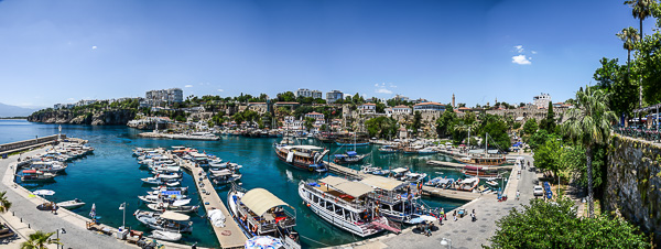 | rammt. Vorbei an einem kleinen Leuchtfeuer eröffnet sich uns nach wenigen Minuten ein wunderschöner Panorama-Blick auf die Altstadt und die Marina von Antalya. Das Wasser ist super blau, es sieht so aus, |